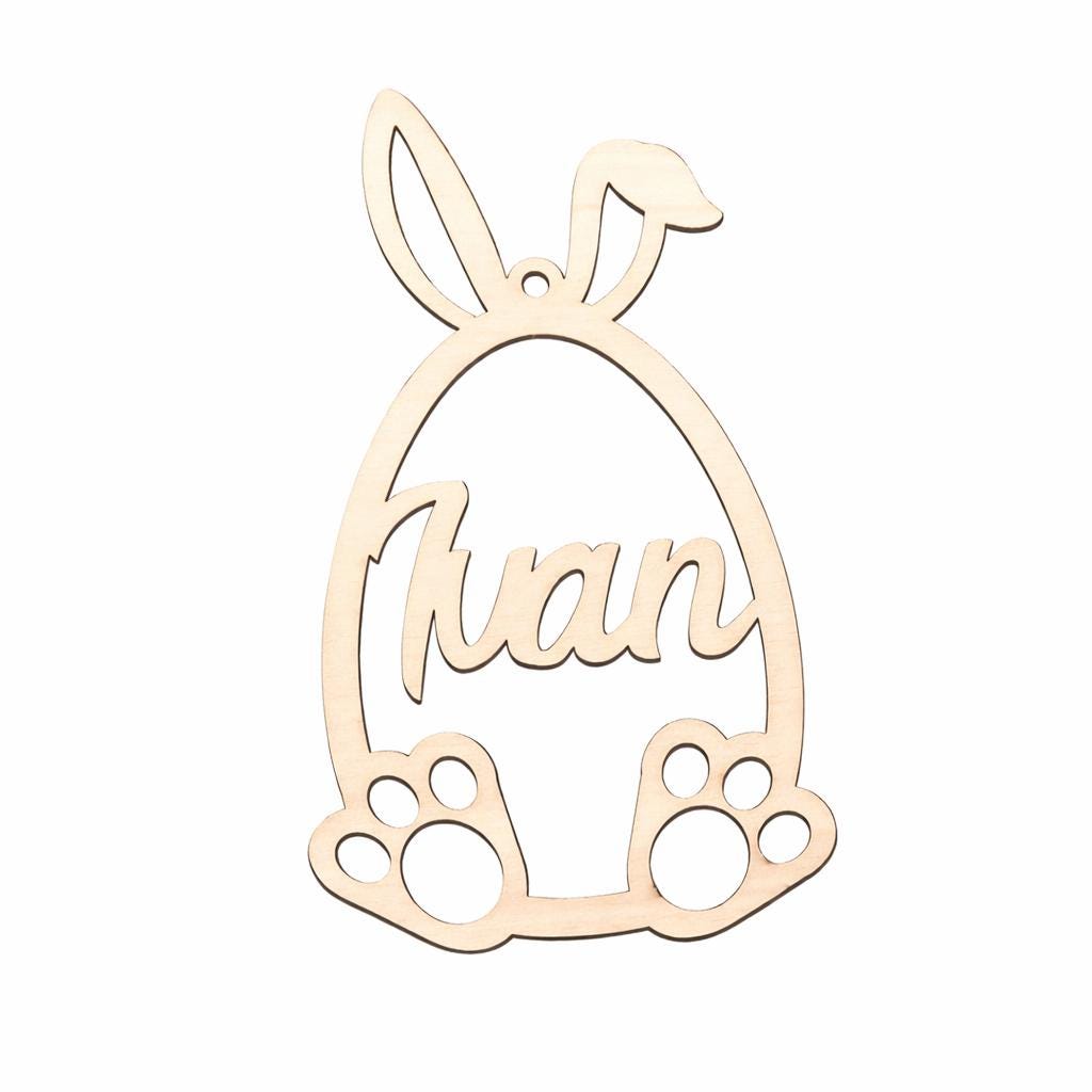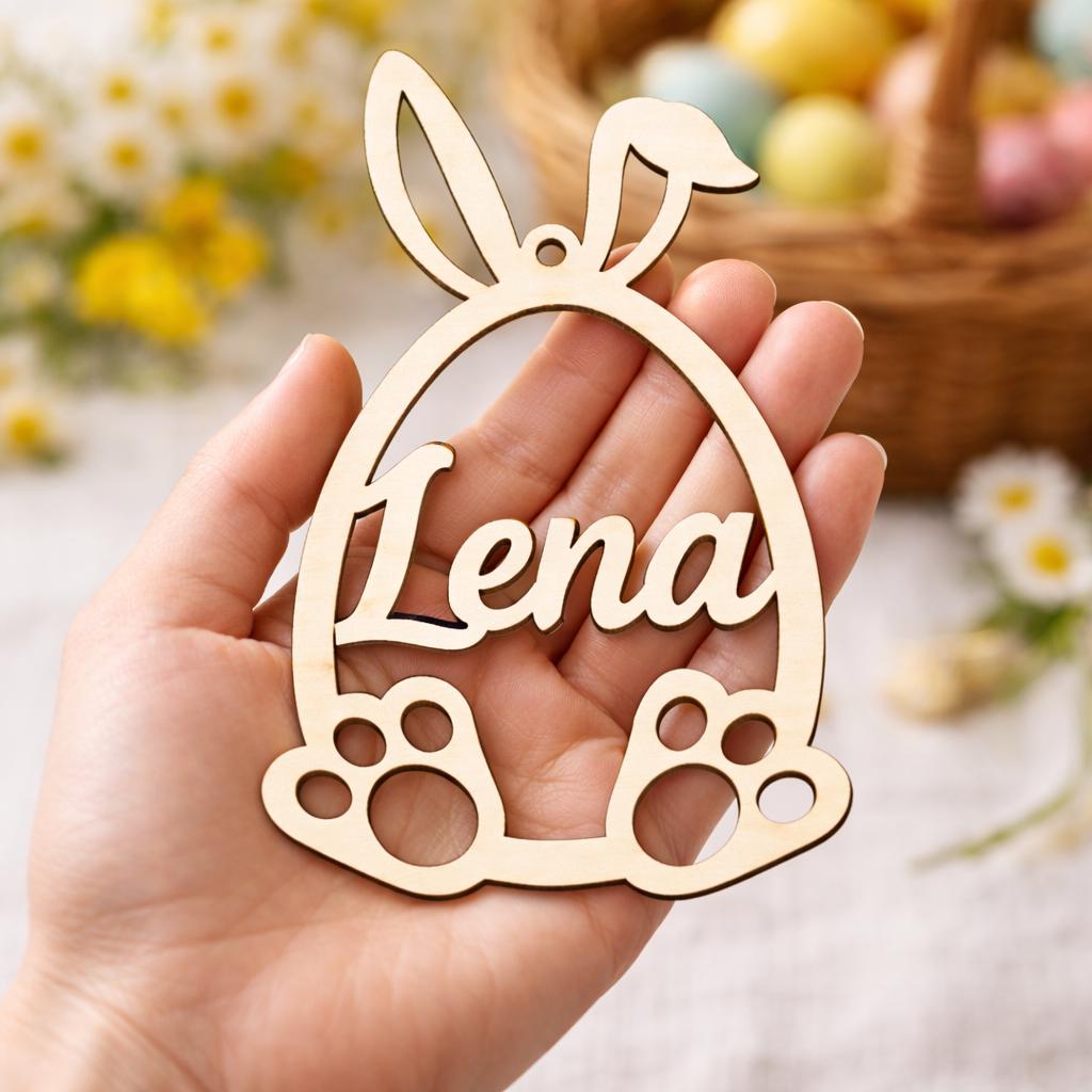 Dieser 15 cm große Holzhase wird individuell mit einem oder zwei Namen personalisiert und ist die perfekte Osterdekoration für Kinder.