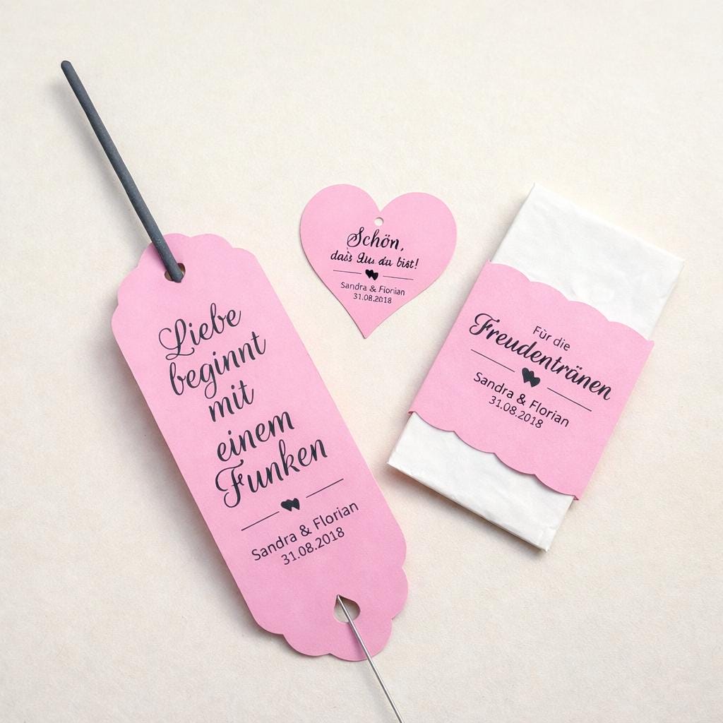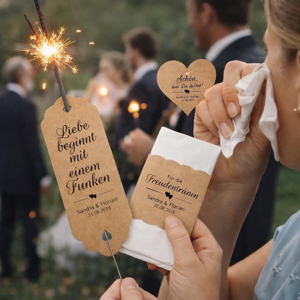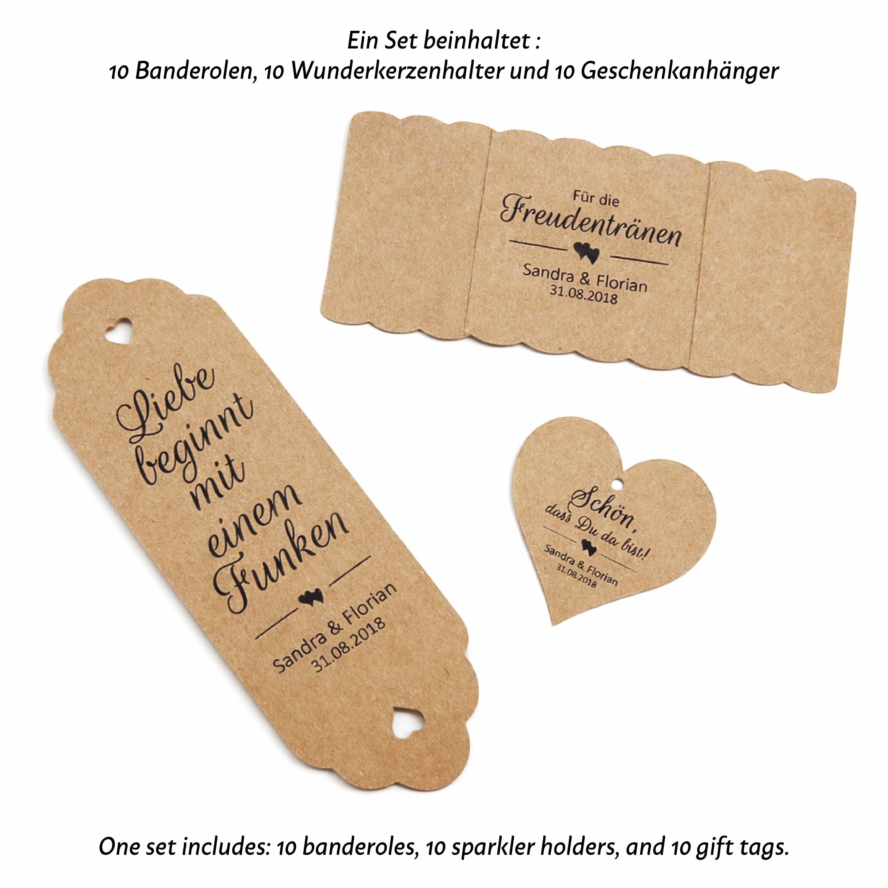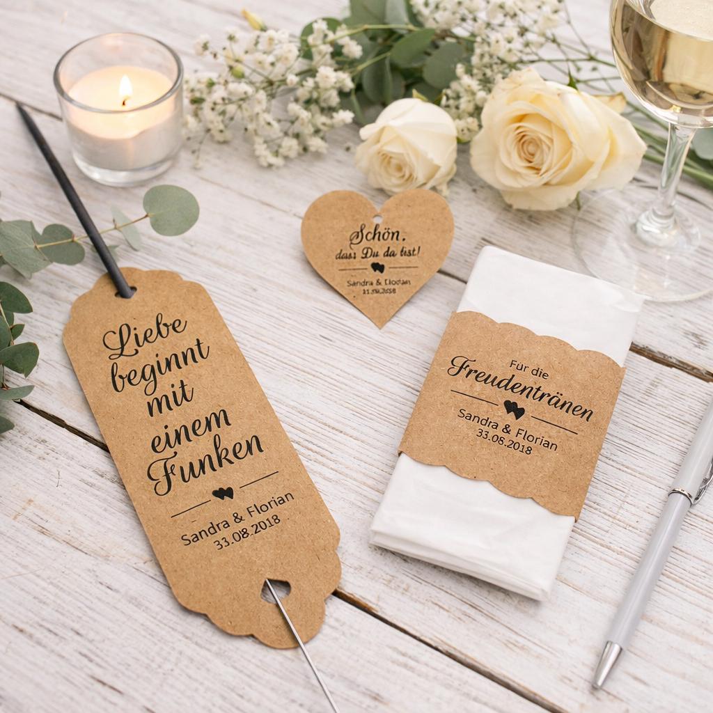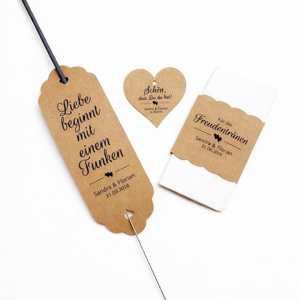 -Verleiht eurer Hochzeit eine besondere, persönliche Note mit diesem liebevoll gestalteten Set aus Wunderkerzenhaltern, Banderolen und Geschenkanhängern im eleganten Kraftpapier-Design 🤍