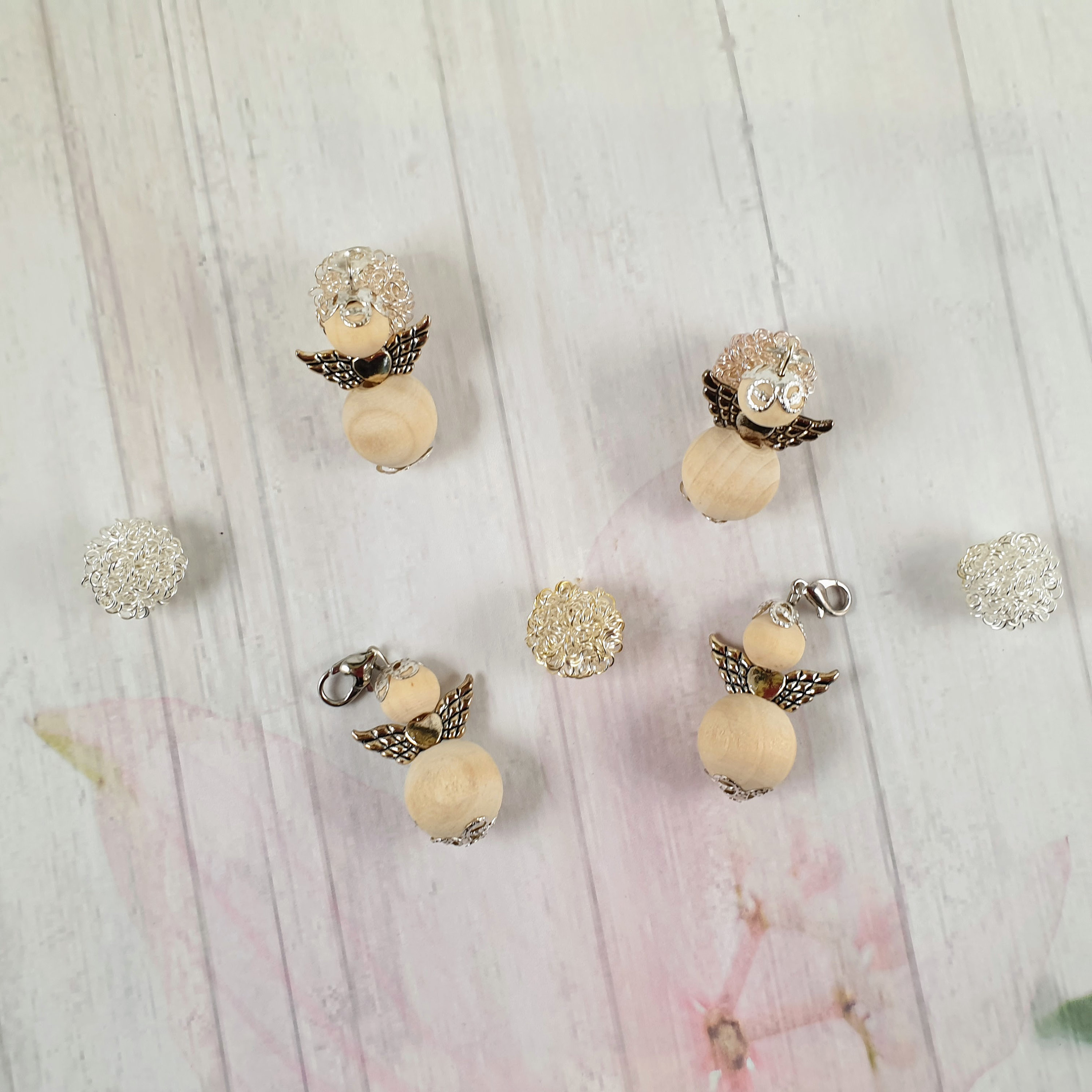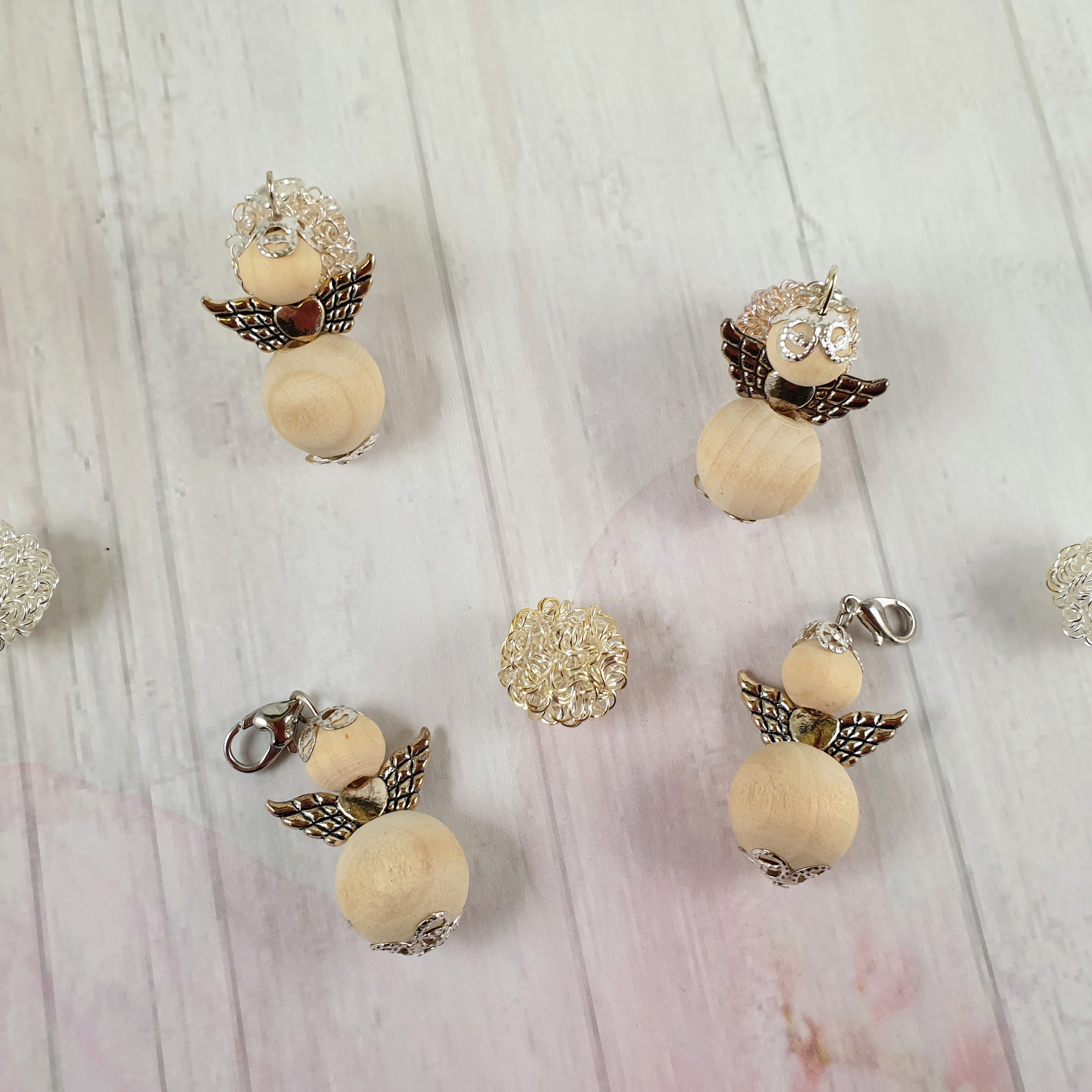 The angels are handmade. Both balls are also made of wood.