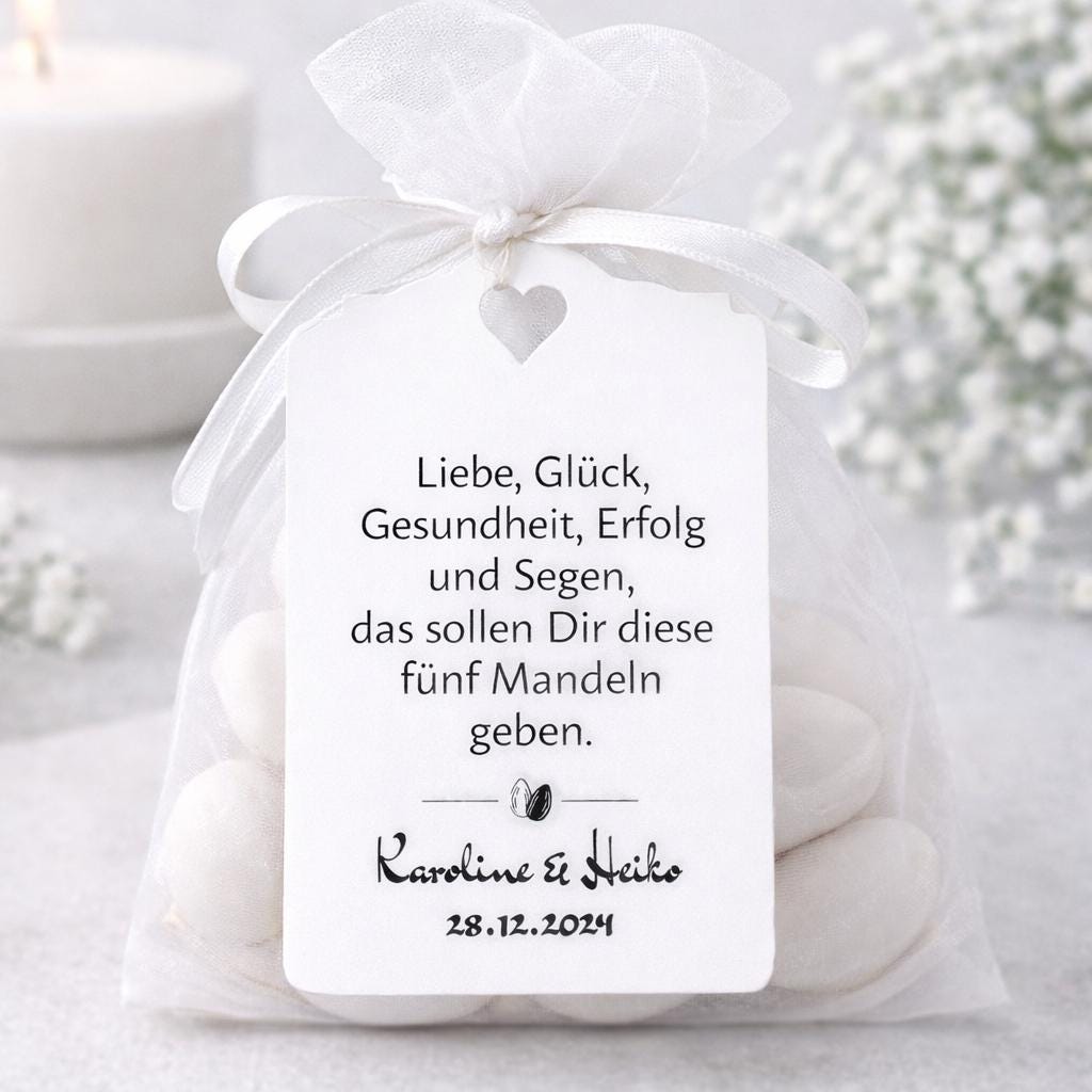 These beautiful favor tags are ideal for weddings, baptisms, communions, or confirmations. Each tag is printed with an almond saying (or your custom text) and personalized with names and date.